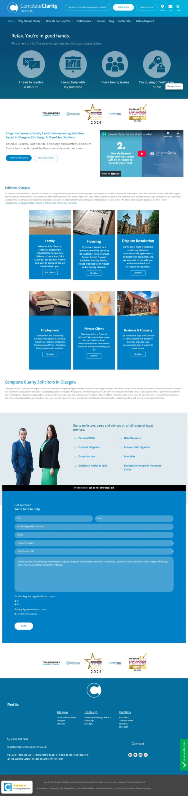 Complete Clarity Solicitors is a modern legal firm offering a wide range of services across Scotland — including family law, employment law, property, litigation, separation & divorce, wills, power of attorney and more. Their priority is delivering clear, transparent guidance to clients, but they needed their digital presence to reflect that same clarity, accessibility, and trust.